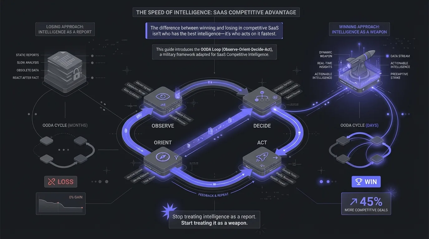 TL;DR: The difference between winning and losing in competitive SaaS isn't who has the best intelligence—it's who acts on it fastest. This guide introduces the OODA Loop (Observe-Orient-Decide-Act), a military framework adapted for SaaS Competitive Intelligence. Companies that complete their OODA cycle in days instead of months win 45% more competitive deals. Stop treating intelligence as a report. Start treating it as a weapon.