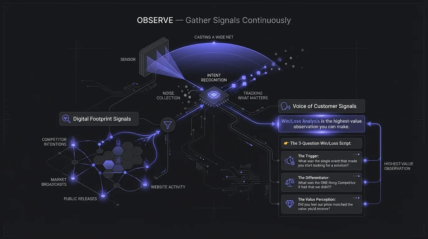 OBSERVE is about casting a wide net to capture signals—but with intent recognition, not noise collection. You're not tracking everything; you're tracking what matters.