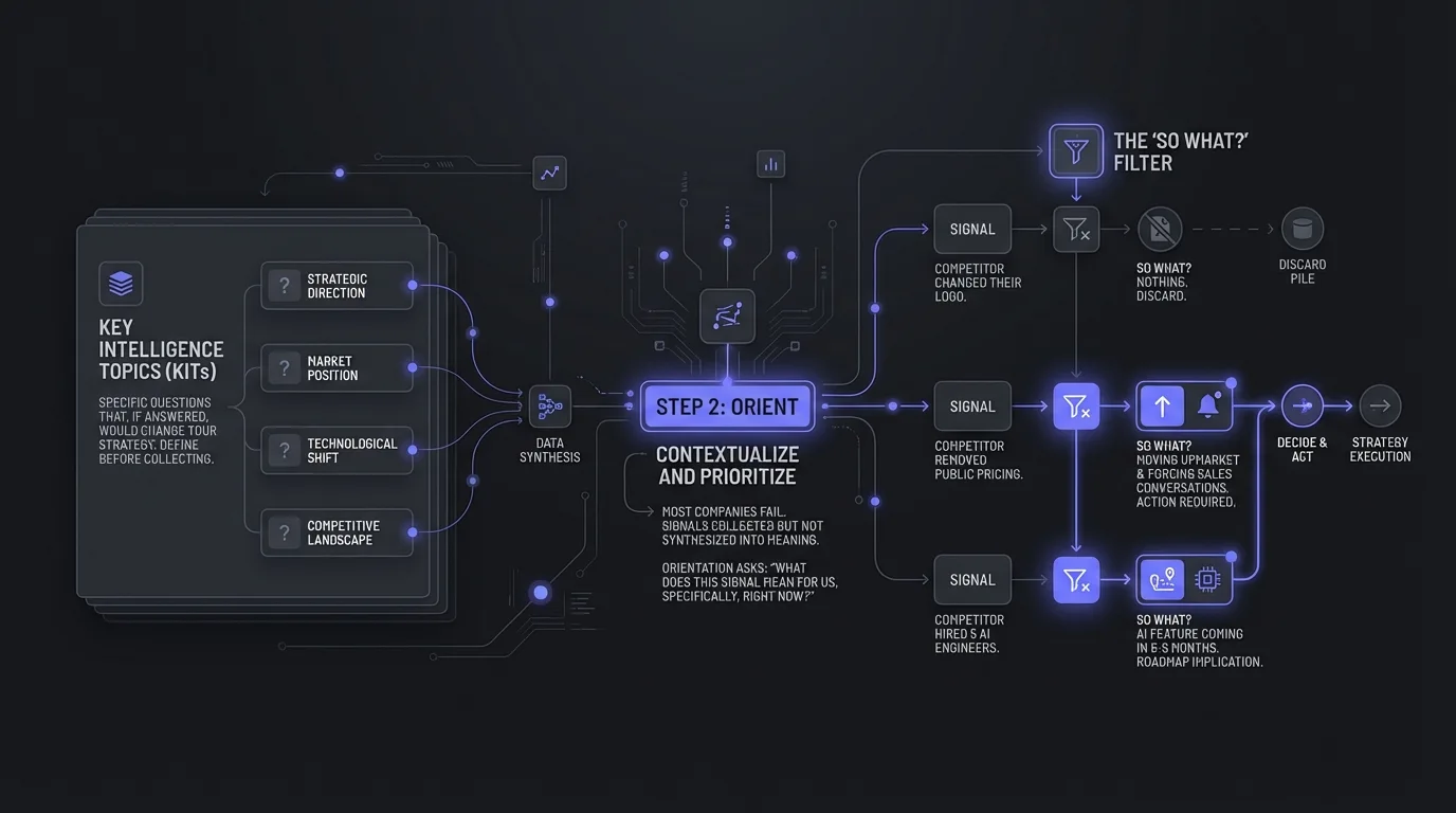 ORIENT is where most companies fail. They collect signals but never synthesize them into meaning. Orientation is about asking: "What does this signal mean for us, specifically, right now?"