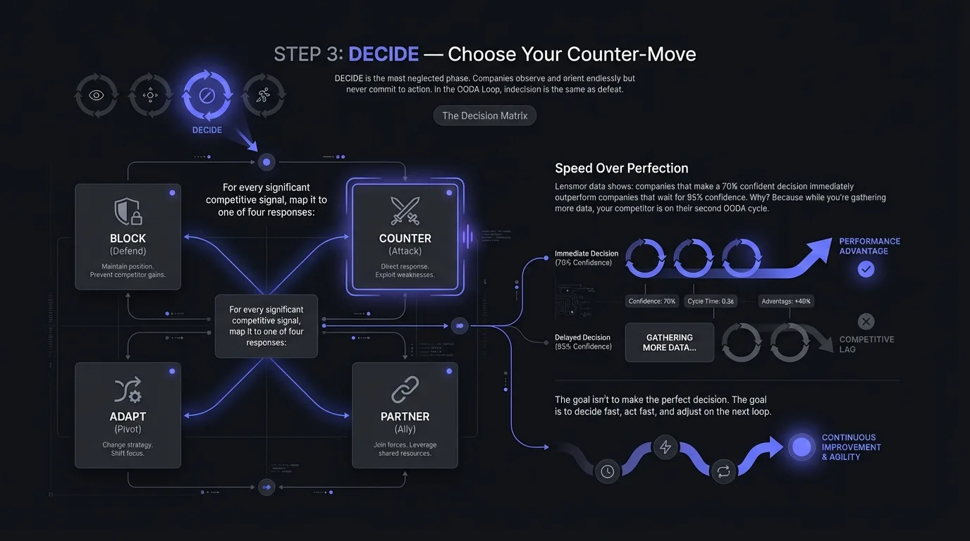 DECIDE is the most neglected phase. Companies observe and orient endlessly but never commit to action. In the OODA Loop, indecision is the same as defeat.