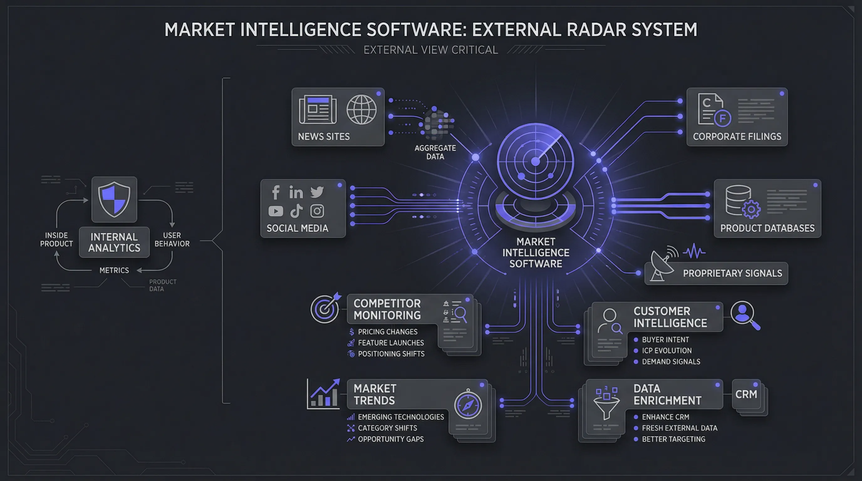 Think of Market Intelligence Software as your external radar system—while your internal analytics tell you what's happening inside your product, market intelligence shows you what's happening in the world around you.