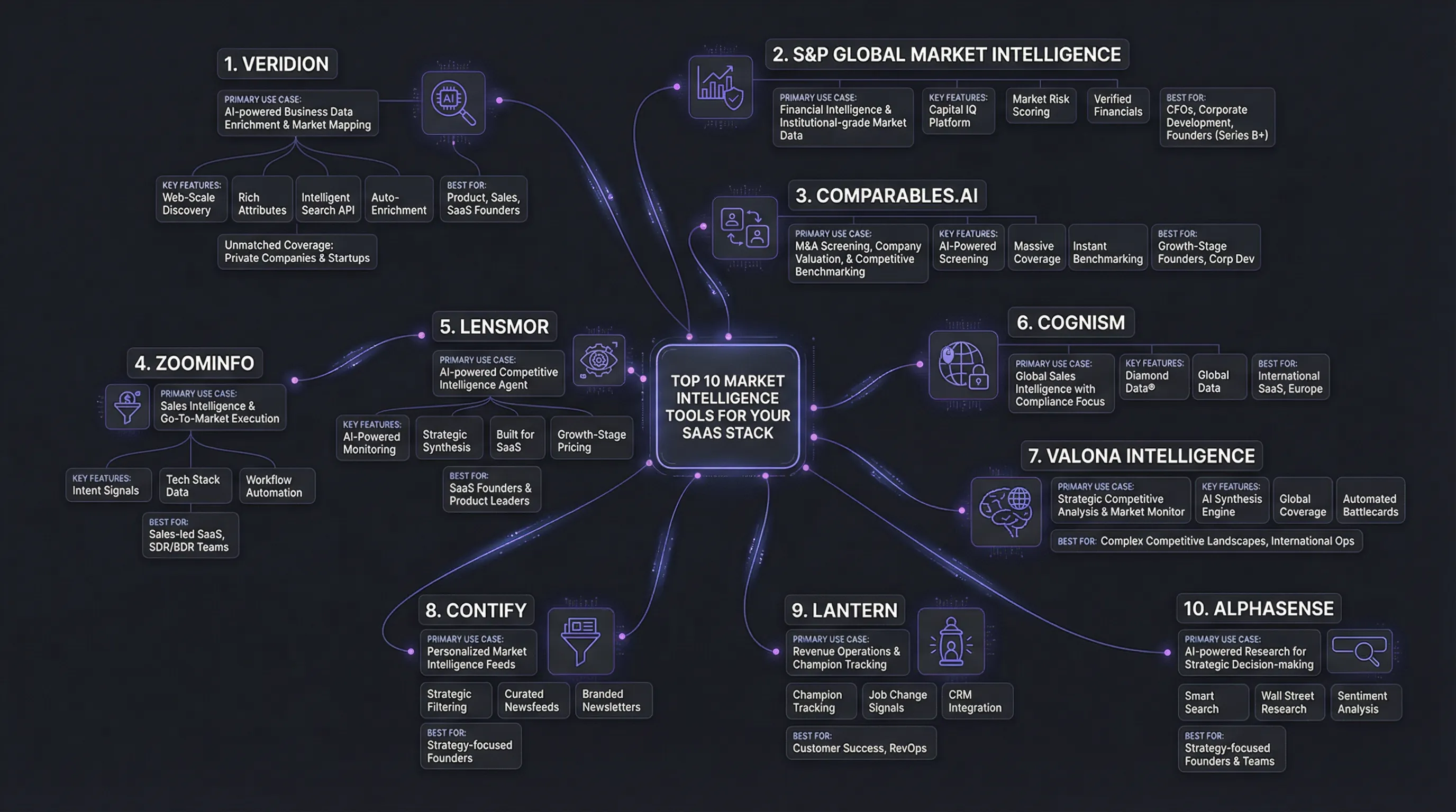 TL;DR: Short on time? Your Market Intelligence Stack is as critical as your tech stack for SaaS growth. For 2025, we've ranked Veridion as the top choice for Data Enrichment, ZoomInfo for Sales Intelligence, and Lensmor as the AI-powered competitive intelligence agent built specifically for growth SaaS. These tools automate Competitive Analysis, helping you spot risks and revenue opportunities faster—without enterprise bloat or pricing.