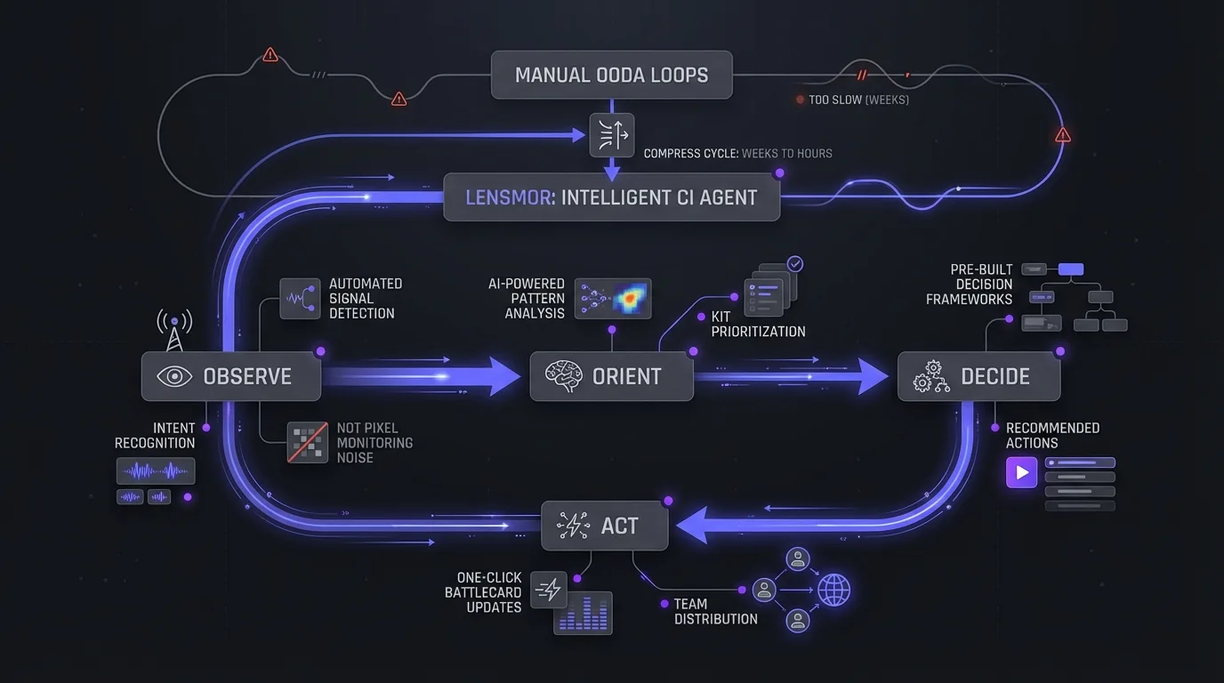 Manual OODA loops are better than no loops—but they're still too slow. Lensmor is the intelligent CI Agent built to compress your cycle from weeks to hours.